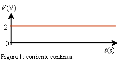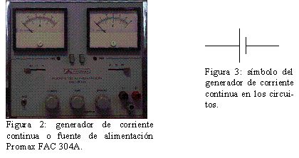 Una corriente continua es una corriente eléctrica que no varía en el tiempo (figura 1). Es por ello por lo que en un generador de corriente continua (figura 2) o fuente de alimentación el único mando que existe es el de ajuste de la tensión ó voltaje de salida, aunque este mando puede constar de uno para ajuste grueso, y otro para ajuste fino. Estas fuentes también pueden tener un mando limitador de intensidad, de tal modo que la intensidad suministrada por la fuente no pueda superar un valor determinado por el usuario. Alcanzado dicho valor, la corriente suministrada se mantiene constante, aunque varíe la tensión de salida de la fuente.