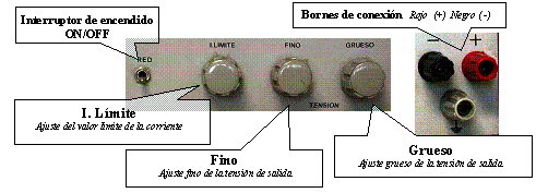 4. El mando i. límite es para limitar la intensidad suministrada por la fuente: se debe colocar inicialmente en un valor medio.
