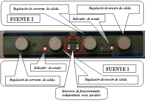 3. Fuentes asociadas en serie (series), con lo que se puede obtener una tensión de 0 a 60V y una intensidad de 0 a 3A.