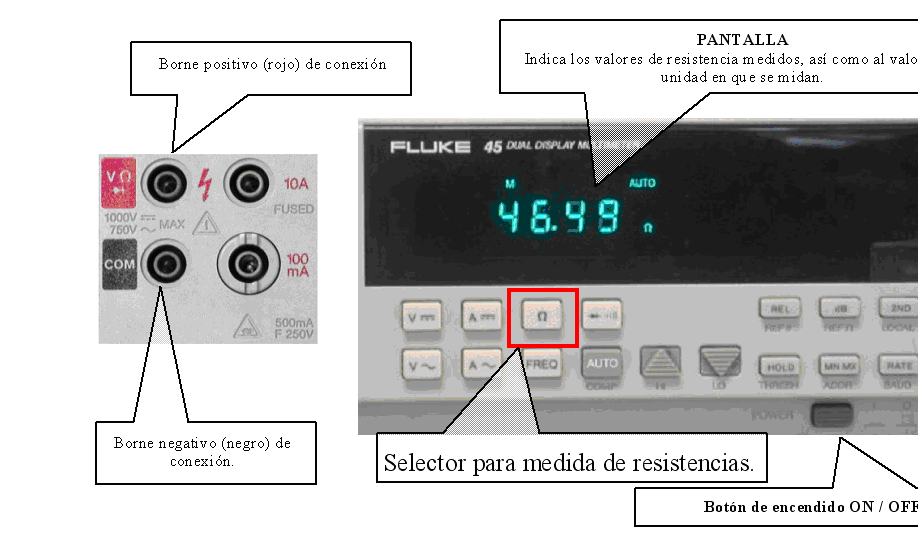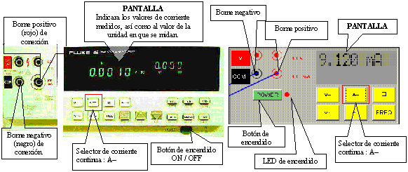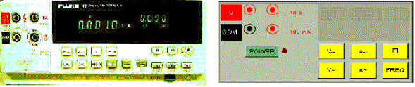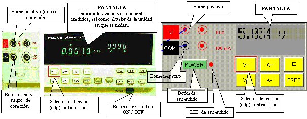 Las posibilidades constructivas y de manejo de los multímetros son variadísimas, pero existen unos patrones de construcción y funcionamiento que son comunes a todos ellos. En la figura siguiente se muestra un multímetro digital Fluke 45, junto a la modelización que se ha realizado del mismo en el programa laboratorio virtual.