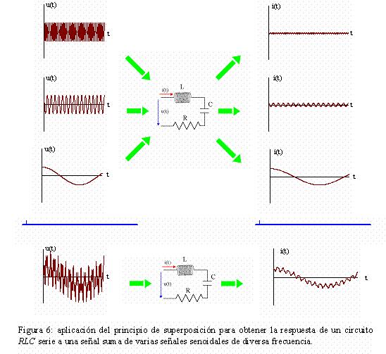 La aplicación del principio de superposición a los circuitos de corriente alterna estudiados implica que la intensidad o d.d.p entre dos puntos del circuito es la suma de las debidas a cada una de las f.e.m. presentes en el circuito y consideradas por separado. Esto implica que si aplicamos a un circuito RLC serie una señal suma de varias señales sinusoidales de distinta frecuencia, la intensidad que circularía por el mismo es la suma de la debida a cada una de ellas. Con lo cual para aquellas señales cuya frecuencia esté alejada de la frecuencia de resonancia la impedancia será grande (intensidad muy pequeña) y para aquellas cuya frecuencia sea la de resonancia o muy próxima, la impedancia será pequeña. La intensidad final será únicamente la respuesta del circuito a las señales de frecuencia próxima a la de resonancia.